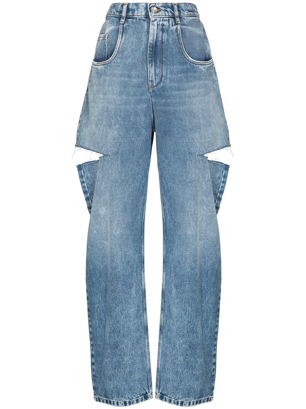 This look relatively tame but they're anything but basic. A little baggy, they have a straight-leg shape and are slashed at the sides to reveal a little skin. Oo er.