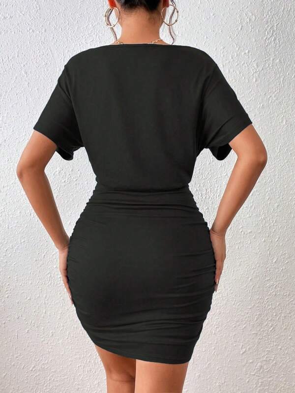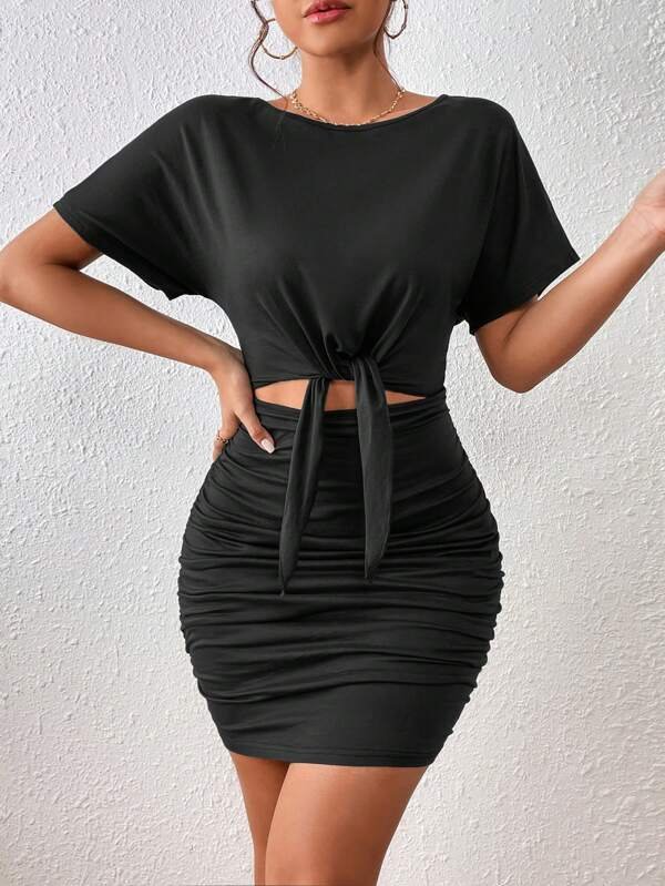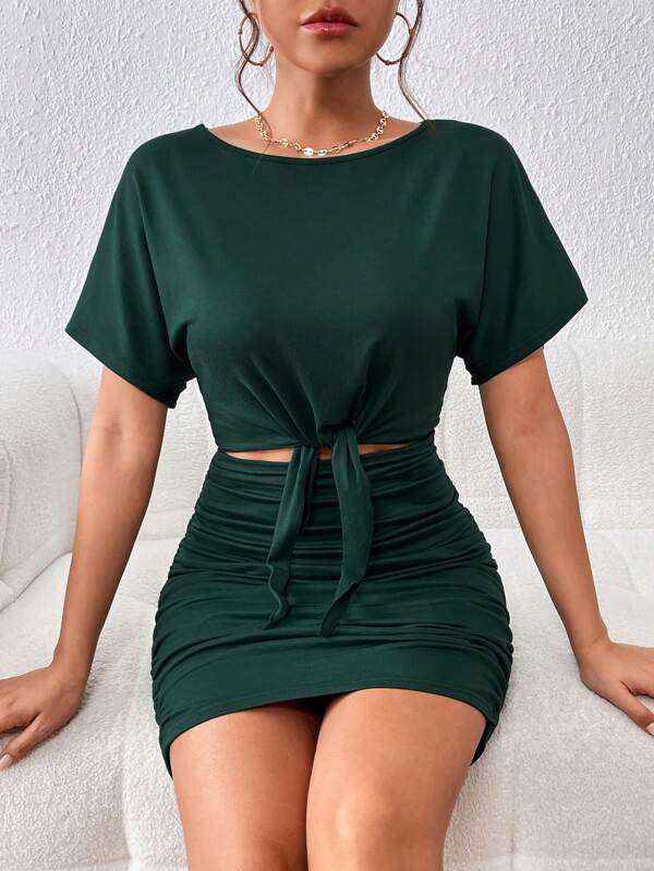 Solva Cut Out Knot Front Ruched Batwing Sleeve Dress