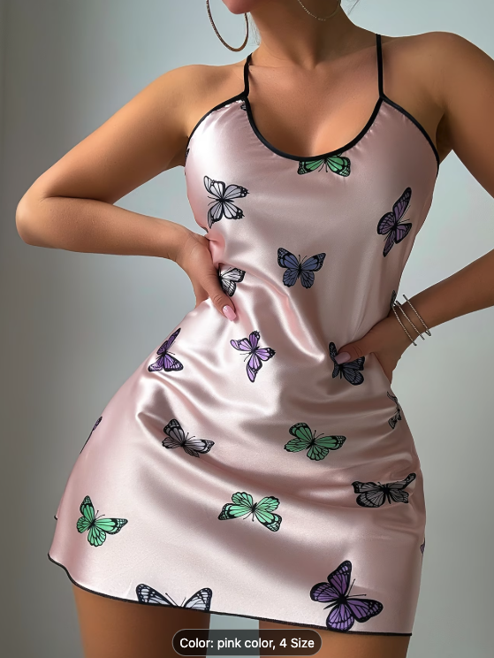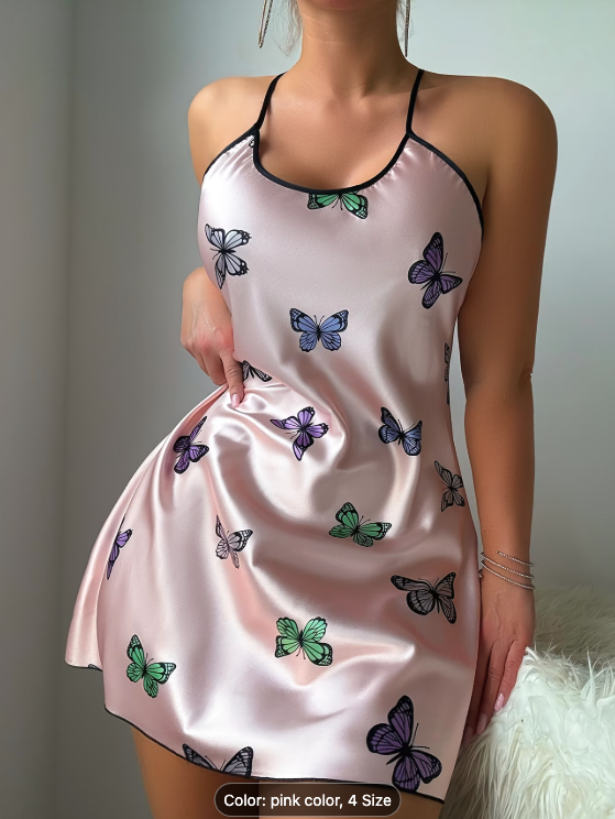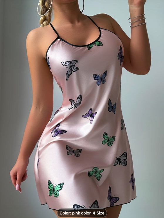 omen'S Sexy Butterfly Print Slip Dress, All-Season Polyester 100% Crew Neck, 90g/m² Woven Fabric, Fashionable Pink Nightgown for Adults